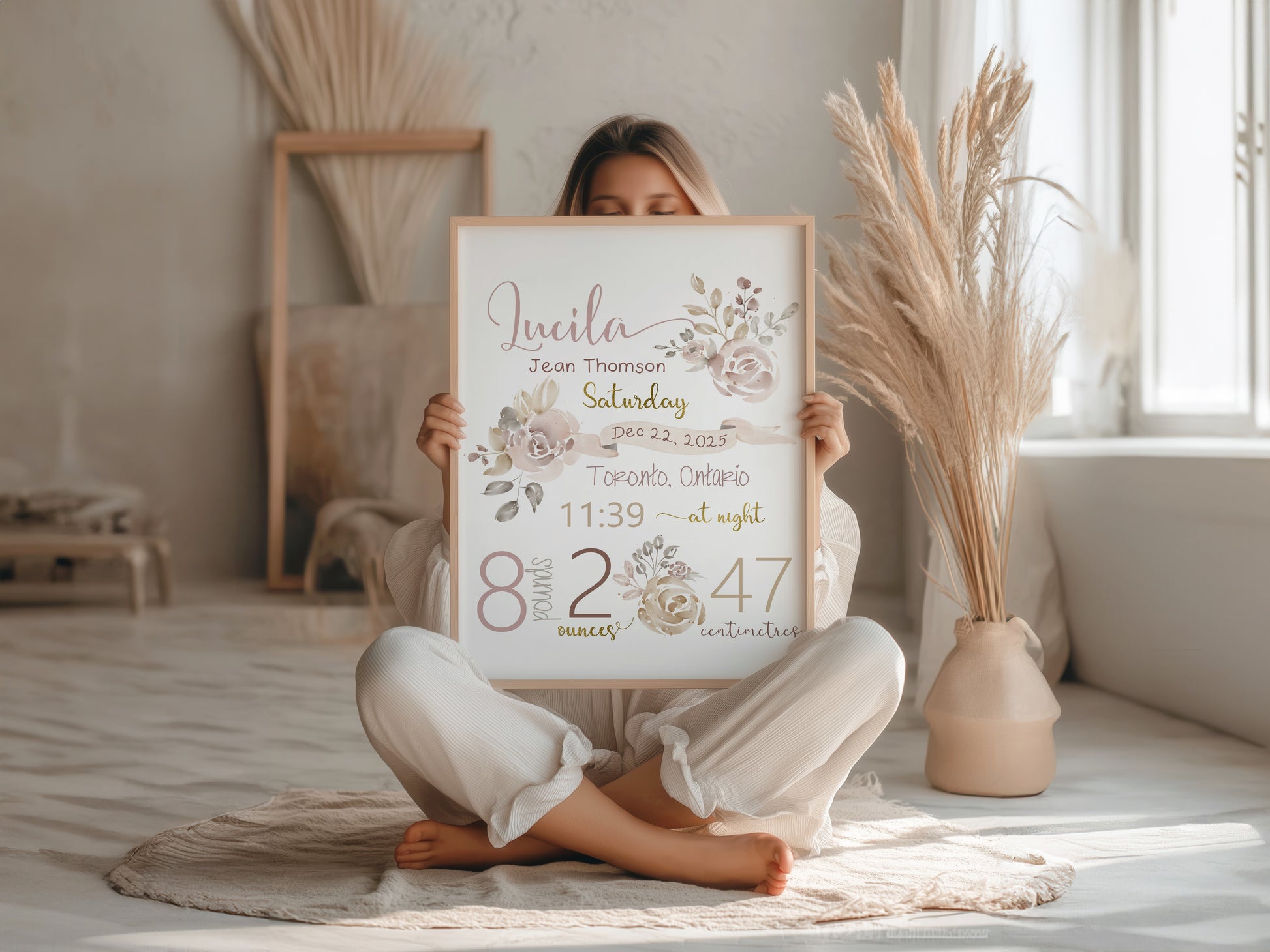 Celebrate your baby's arrival with our beautifully designed Floral Birth Announcement. Featuring soft watercolor elements, this personalized nursery art adds a charming, whimsical touch to your baby's room. Whether you're decorating your own space or looking for a thoughtful baby shower gift, this birth announcement doubles as a timeless keepsake for new parents.
